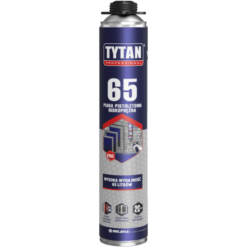 Tytan Professional 65 to wysokowydajna i niskoprężna piana pistoletowa, która jest doskonałym rozwiązaniem w instalacji stolarki otworowej oraz w pozostałych wymagających pracach budowlanych. Dzięki wysokiej wydajności produktu z jednej puszki można zainstalować więcej okien niż przy użyciu piany o standardowej wydajności.