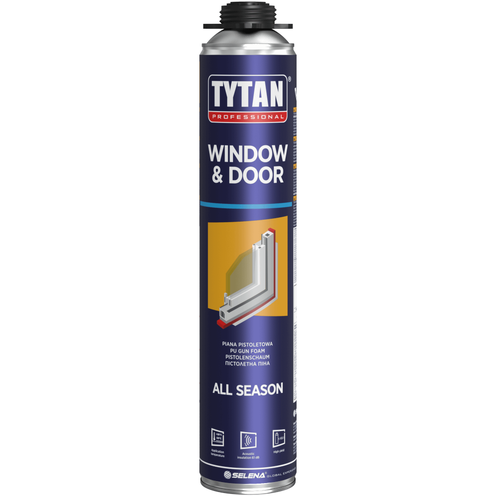 Tytan Professional WINDOW & DOOR All Season GUN PU Foam to wysokowydajna piana pistoletowa, która utwardza się pod wpływem wilgoci. Przeznaczona do uszczelnień przy montażu stolarki otworowej, oferuje doskonałe parametry izolacji cieplnej i akustycznej. Po utwardzeniu pianę można ciąć, piaskować, gipsować lub malować. Jest odporna na pleśnie, grzyby oraz na ekstremalne temperatury od -60°C do +100°C. Piana spełnia normę ISO 9001 i nie emituje szkodliwej substancji MDI podczas aplikacji, co zwiększa bezpieczeństwo pracy.