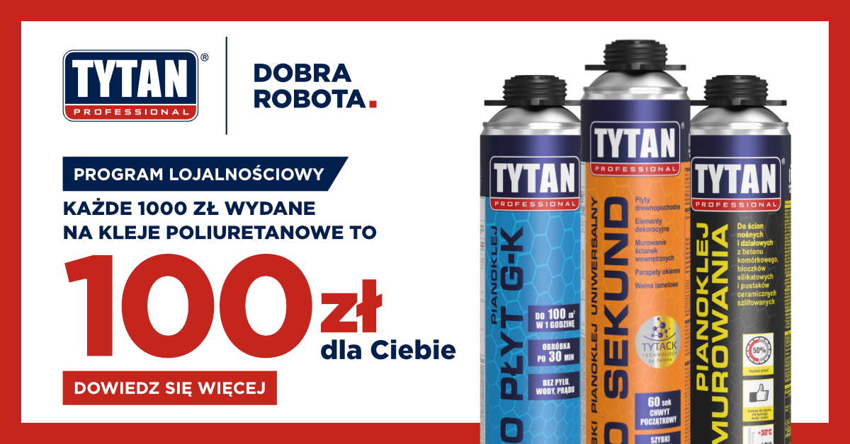 Listopad i grudzień to idealny moment, żeby zrobić zapasy i zyskać gotówkę! Kupując kleje poliuretanowe Tytan Professional, otrzymasz 100 zł premii za każde wydane 1 000 zł netto. Żadnych punktów, żadnych haczyków – tylko gwarantowana premia za Twoje zakupy!
