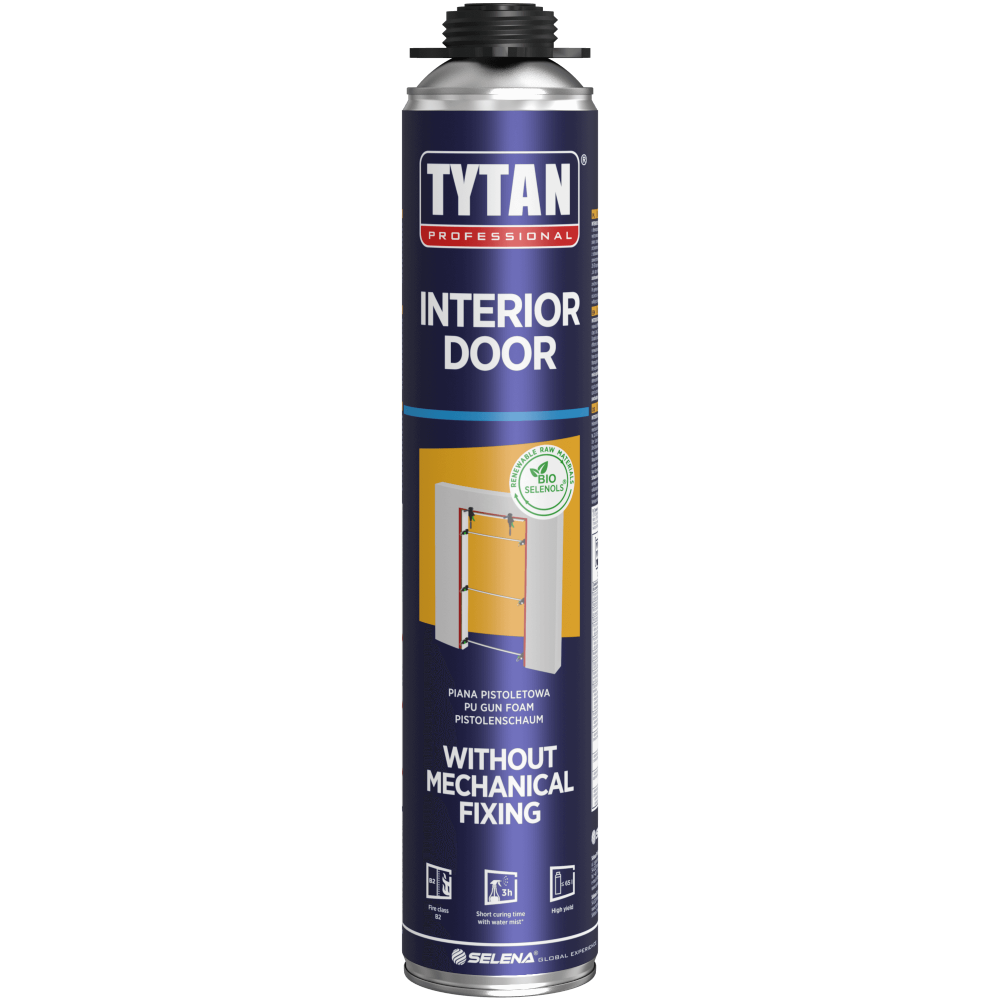 INTERIOR DOOR to piana do montażu drzwi wewnętrznych z drewna i materiałów drewnopochodnych (MDF, płyta wiórowa) bez użycia łączników mechanicznych (do ościeżnic w klasie wytrzymałości mechanicznej 1 i 2 wg EN 1192 oraz klasie N wg RAL RG 426). Piana charakteryzuje się niską, kontrolowaną rozszerzalnością (post-ekspansją), która nie powoduje deformacji ościeżnic. Receptura piany bazuje częściowo na surowcach pochodzących ze źródeł odnawialnych.